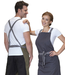 65% polyester/35% cotton. Contrast grey neckband and thick webbing cross back ties. Large front pocket. Width 71cm. Length 91cm. Domestic wash 60°C.