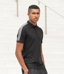 Moisture wicking finish. High stretch fabric. Ribbed collar and cuffs. Taped neck. Three self colour button narrow placket. Contrast shoulder and sleeve panels. 98% polyester/2% elastane micro piqué. 240g