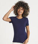 100% combed ringspun cotton.* Ladies fit. Ribbed collar. Taped neck. Side seams. Twin needle sleeves and hem. Unbranded size label at neckline.